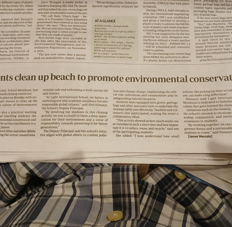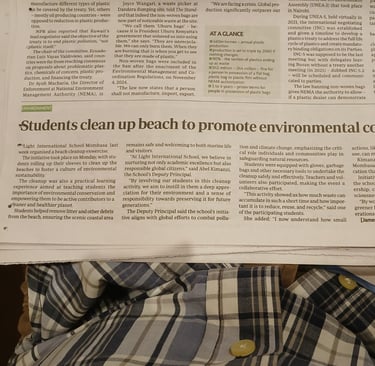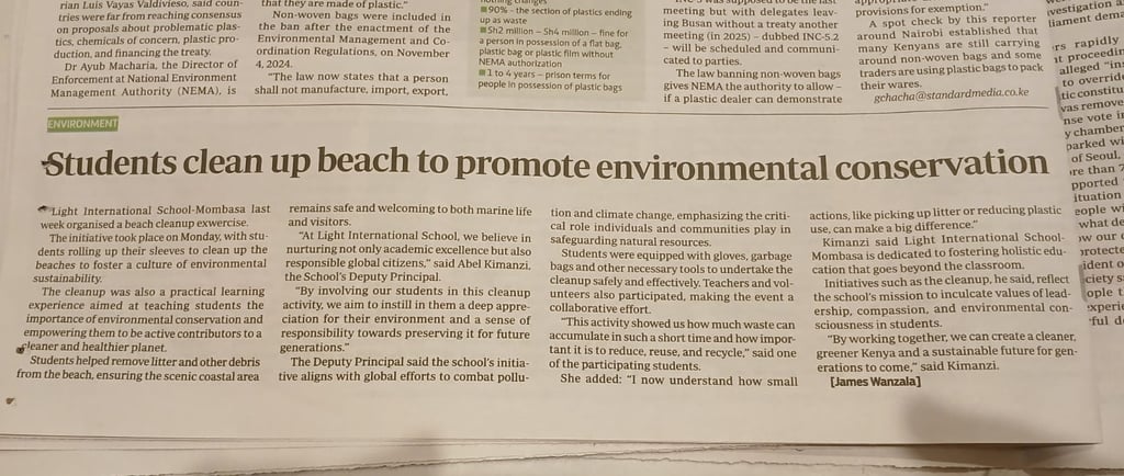 In December, students from Light International School Mombasa demonstrated leadership in environmental sustainability by participating in a beach cleanup campaign. This activity aimed to promote environmental awareness and foster a sense of responsibility among students.